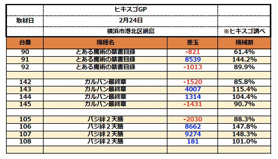2024年2月26日 未分類 2/24(土)取材結果#横浜市港北区綱島💪 TWEET 店舗 横浜市港北区綱島 取材日 2024/02/24 地域 横浜市港北区綱島 ・とある魔術の禁書目録 ・ガルパン最終章 ・バジ絆2天膳 とあると天膳が万枚目前のヒキスゴ! 次回開催も要チェック!! 注目箇所